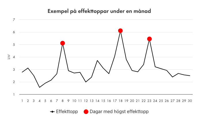 Om ditt genomsnittliga effekttopp är 5 kW under en månad skulle effektavgiften bli cirka 400 SEK, medan en topp på 14 kW skulle kosta cirka 1130 SEK.