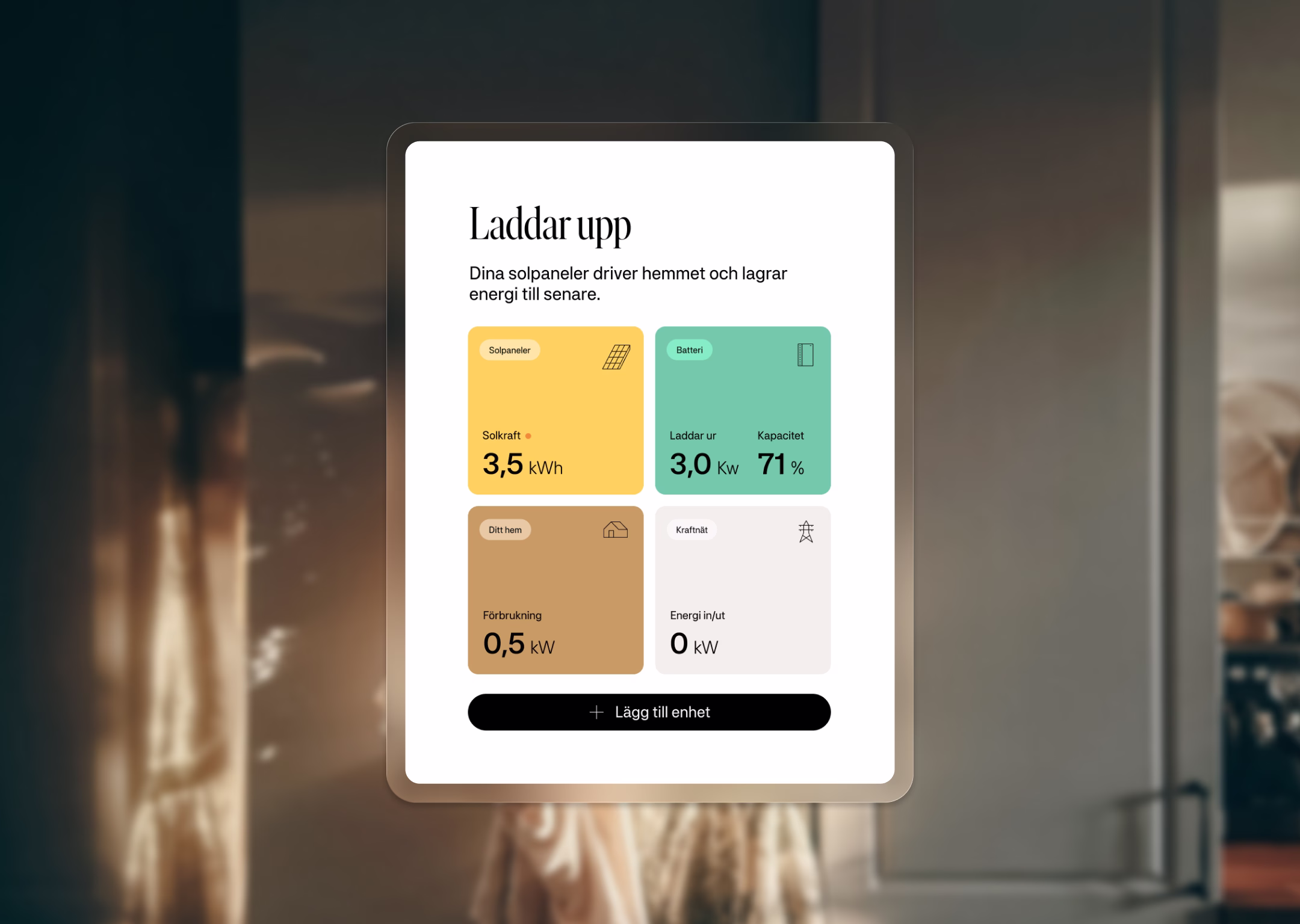 Laske sähkökustannuksiasi, varastoi aurinkosähköä ja ansaitse rahaa sähköverkon tasapainottamisesta älykkään sovelluksemme avulla. Toistaiseksi saatavilla vain Ruotsissa.