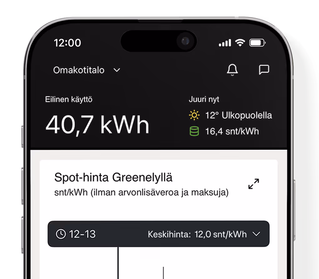 Ota sähkönkulutuksesi hallintaan ja pienennä sähkökustannuksia Greenely-sovelluksen avulla. Seuraa spot-hintaa 15 minuutin välein, yhdistä älylaitteesi automaattiseen ohjaukseen halvimmille tunneille ja saat yksityiskohtaista tietoa energiankäytöstäsi.